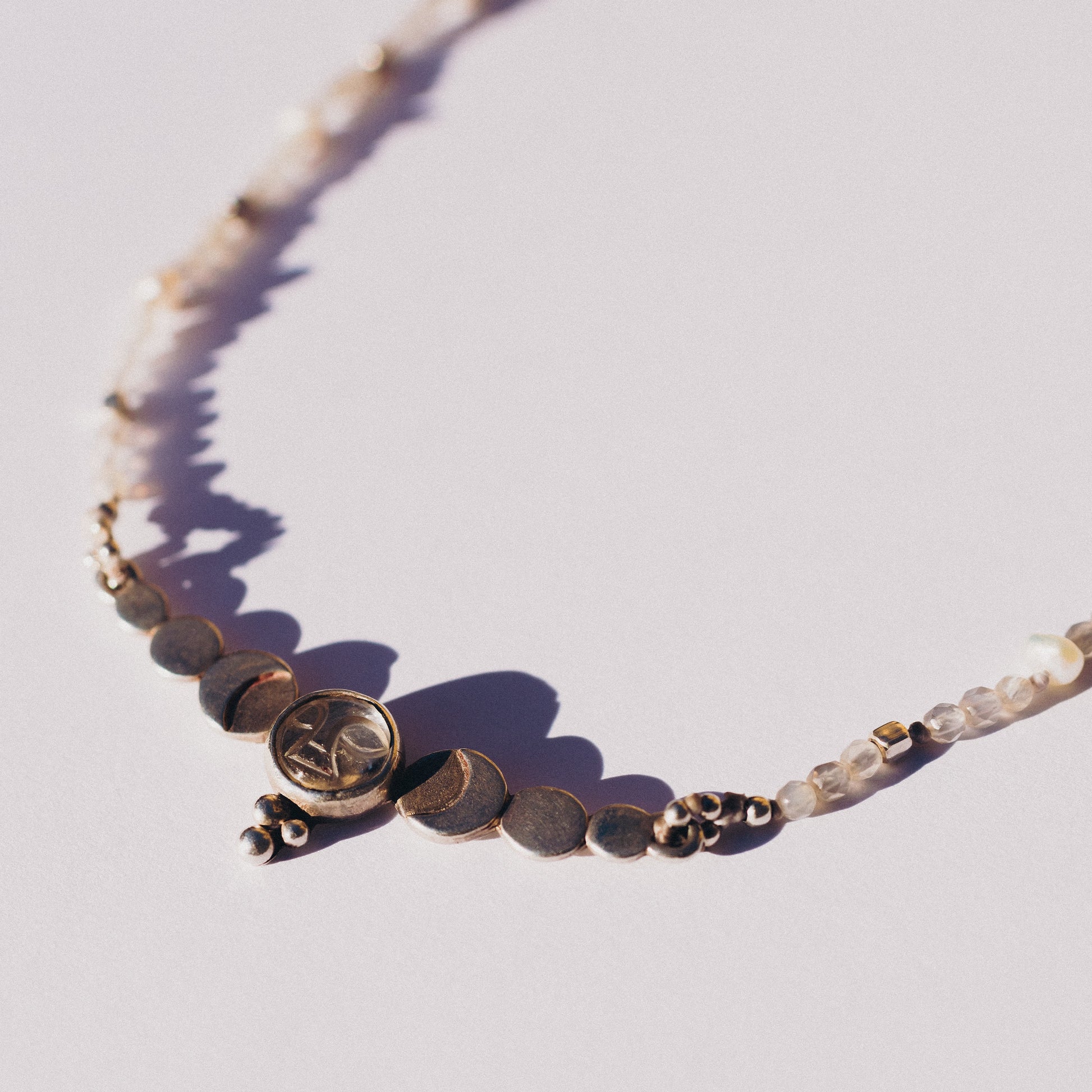 Cada collar tiene su propio sello: puedes elegirlo con cadena de plata o con piedras naturales, pero lo que nunca cambia es su centro mágico — una luna llena tallada en piedra luna, con un rostro real que guarda la energía de los ciclos.
